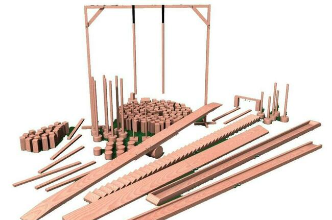 Dane materiałowe: Zestaw składający się z 18 elementów, służący do nauki i doskonalenia techniki jazdy na rowerze. Szczególnie zalecany w czasie egzaminów na kartę rowerową oraz turniejów BRD na szczeblu szkolnym, gminnym, powiatowym, wojewódzkim i ogólnopolskim. Rowerowy tor przeszkód wykonany z drewna suszonego, klejonego warstwowo i zabezpieczony drewnochronem.