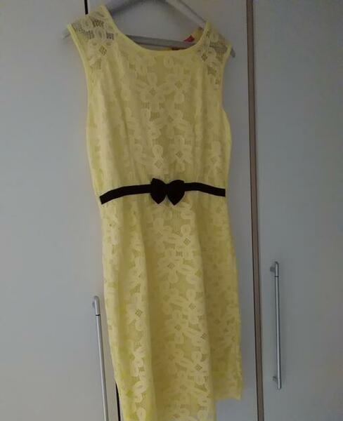Sprzedam Żółtą Sukienkię Koronkową Z Kokardą Miss Clasic Rozmiar XXL Stan Dobry Jak Widać To Na Zamieszczonych Zdjęciach Zapinnana z Tyłu Na Zamek Wymiary