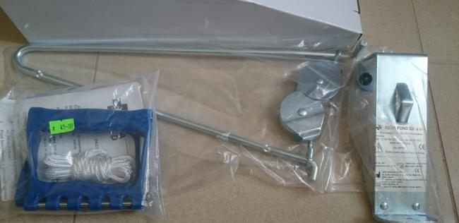 W komplecie: linki, wieszaki, klamra V, klamra drzwiowa, bloczki oraz uchwyty na ręce