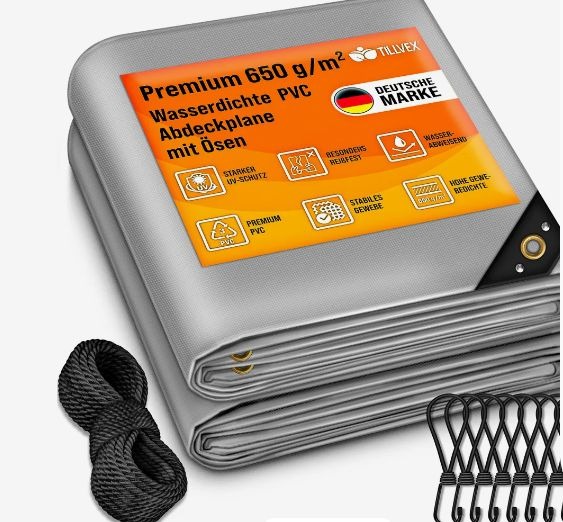Plandeka tillvex to wysokiej jakości, ciężka plandeka materiałowa wykonana z PVC o gramaturze 650 g/m². Jest w pełni wodoodporna, odporna na rozdarcia oraz przystosowana do całorocznego użytku na zewnątrz. Dzięki wzmocnionej konstrukcji i aluminiowym oczkom zapewnia solidne i bezpieczne mocowanie.