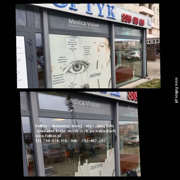 Usługa zrywania folii- demontaż starych reklam - starej folii z szyb ,usuwanie folii z witryn sklepowych, wymiana zniszczonej folii na nową - mycie szyb, usuwanie kleju, naklejek.