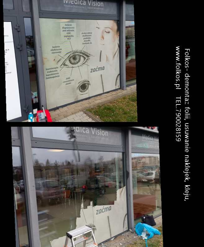 Usługa zrywania folii- demontaż starych reklam - starej folii z szyb ,usuwanie folii z witryn sklepowych, wymiana zniszczonej folii na nową - mycie szyb, usuwanie kleju, naklejek.